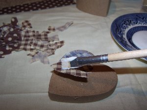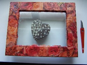 Remember that you are overlapping paper all the time, so allow for papering a larger area. I used all of the rose paper you see in the picture. This frame also comes apart but for convenience, I decoupaged it as it was, standing.
