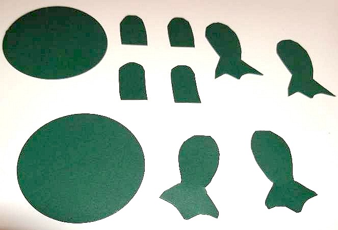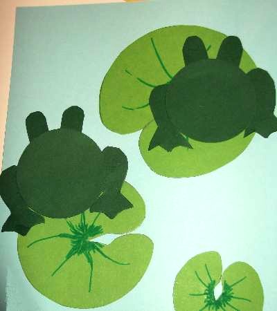 Now cut out dark green frog shapes to make 2 frogs and stick the pads and then the frogs onto a contrasting card, size A5