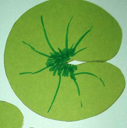 To make a green lily pad draw a fat C shape and cut it out. Draw lines coming from the center. You can do 2 or 3.