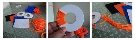 You will need some wool. Maybe 2 colors will make it interesting and you will need 2 cardboard rings the same size. Ask an adult to cut them out for you if you are not used to using scissors. Don`t make the hole too big. The hole should be no bigger that the width of the ring. See the picture for reference. I have shown some squares of felt of different colors so that if you like you can cut and paste googly eyes and ears to make funny animals out of your pom poms.