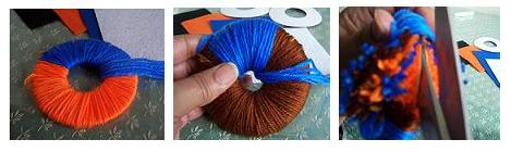 Keep winding the different colors of wool around the rings. The hole in the middle will eventually become too small making it difficult to wind more on.