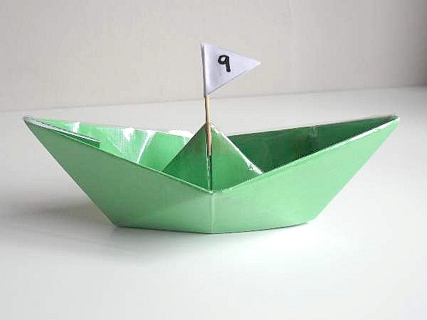 You are now going to pull the two top corners sideways from each other. As you do, you will notice that a peak is coming out from inside. This is the boat mast. Keep pulling until the shape flattens and then press it on the table. Open up the bottom of the paper boat to help it float. Time to make the flag with a number.