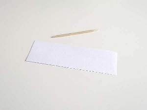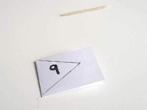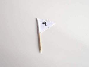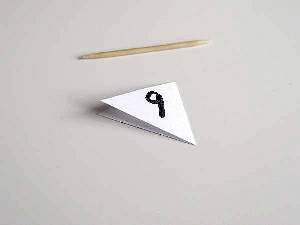 You will need a cocktail stick for the flag and a 2 x 1 inch strip of white paper. Fold the paper in half and draw a diagonal line from each corner to meet in the middle. Cut along both lines. Choose a number for your boat and mark it on both sides of the flag. Paste some glue inside and stick it around the cocktail stick. Almost there! Place the cocktail stick down between the center folds of the mast and stick it in place with clear adhesive tape. To stop your boat from leaning to one side, place a small pebble in the opposite side.