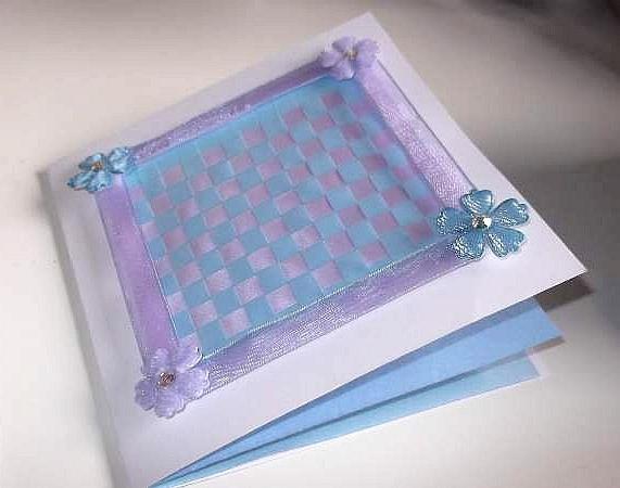 Here is the same paper weaving design using different colors and embellishments. It was given to a friend who gave birth to a baby boy. An embroidered, iron-on teddy bear was fixed to the inside which could be removed later and pressed onto a baby grow or some other item of clothing. |