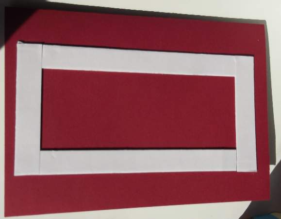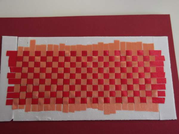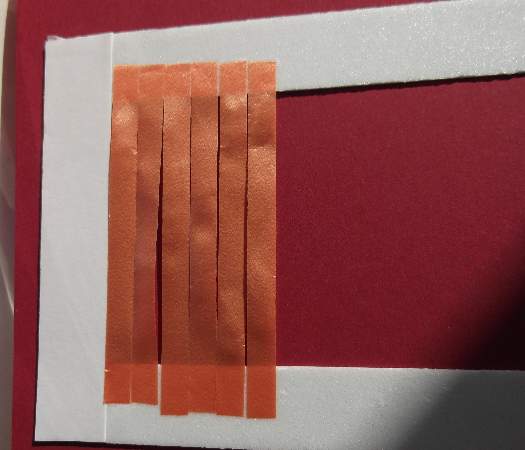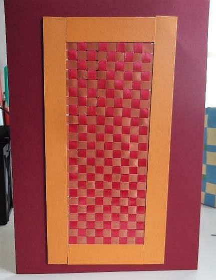 When you fill the shape with paper weaving measure and cut colored card strips to frame your design. They need to be the width of the double sided tape to hide it. Now remove the rest of the backing paper of the tape and stick the frame in place. |