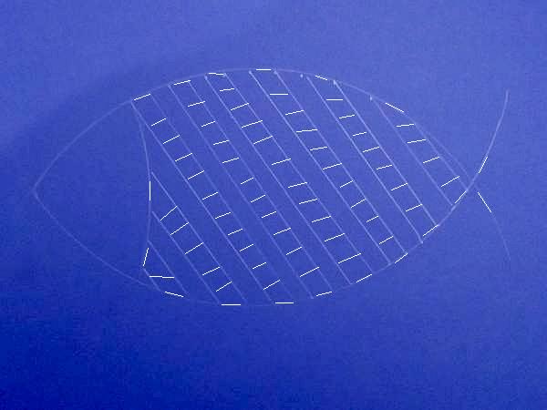 On a thick piece of blue card I drew the fish outline using the edge of a paper plate for the two opposite curvy lines. It worked a treat! Then I marked out the head and diagonal lines running parallel to each other with smaller lines running in between making them look like railway tracks.