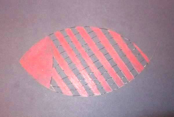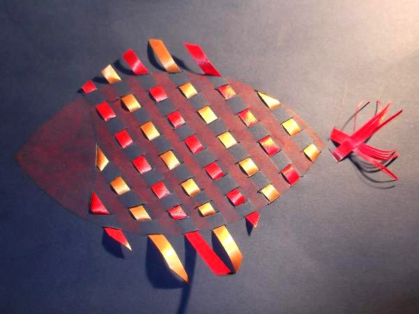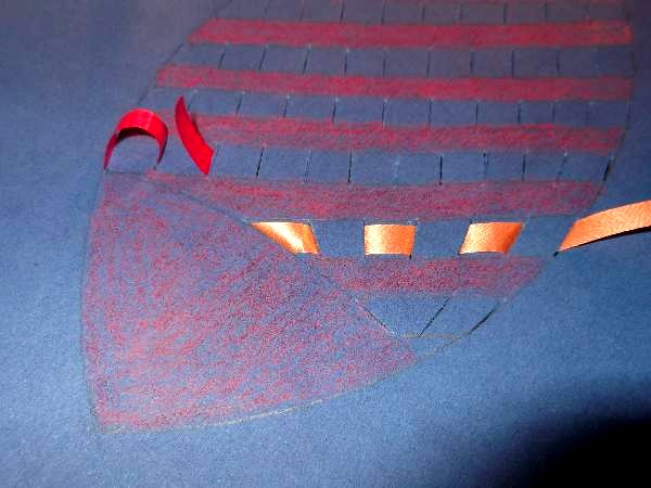 Once you have completed that part, start the paper weaving. See the illustration to see how I have used the colors and left a good measure of ribbon at the ends for the fins. Fix the ribbon in place by taping it on the reverse side. |