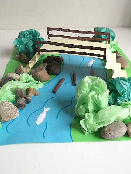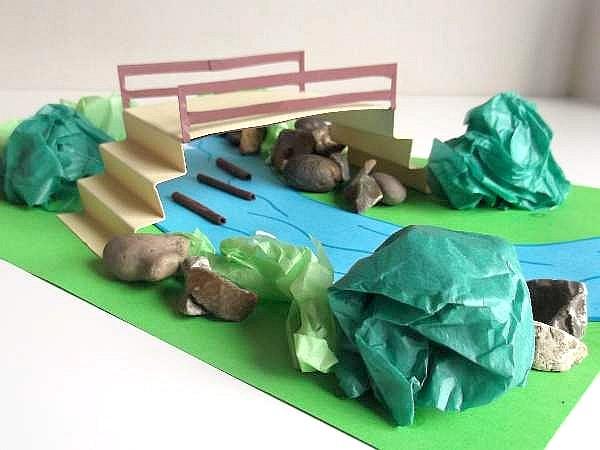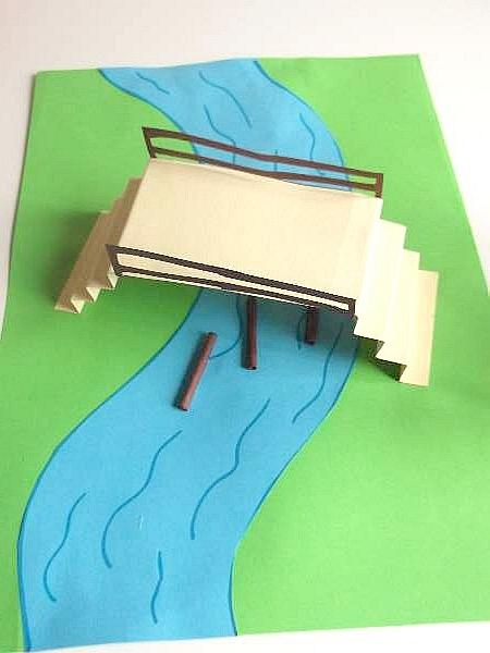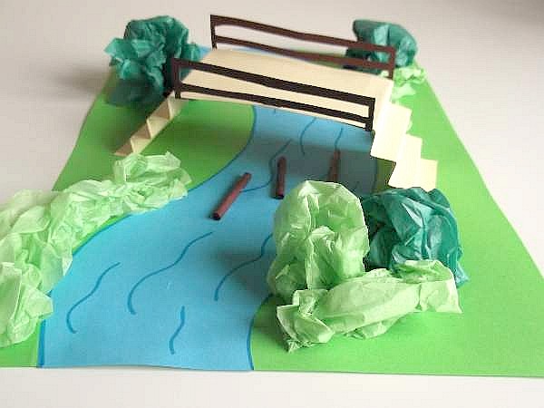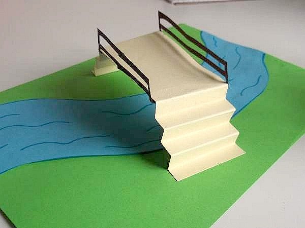 To make a bridge, cut a 2 x 8 1/2 inch oblong from the tan card and make 6 folds at each end to make the steps. Stick the ends to each side of the river.