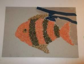Draw a penciled outline of a fish or some other simple-shaped creature. I have drawn a striped fish for my mosaic so that I can fill in the stripes with contrasting seeds. Do not paste glue all over your picture but work in sections. |