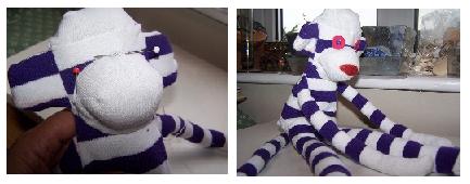Pull the sock monkey right side out. It is beginning to look like one now. You should only have two gaps left. The slit for the tail and the opening in the leg seam.